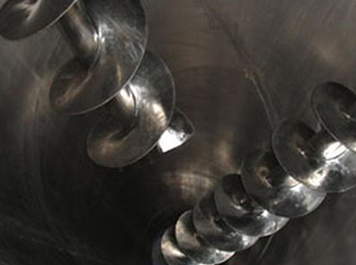 雙螺桿混合機由電機經(jīng)減速機驅(qū)動特殊布置的螺帶主軸旋轉(zhuǎn),外部的螺條將物料移到中心但置,內(nèi)部的螺條將物料推到一定位置或端板,兩者使物料作相互擴散、對流、剪切、錯位和輻射狀運動,從而使物料在短時間內(nèi)達到混合均勻的效果。有三種標準的攪拌設(shè)計 --- 連續(xù)式螺帶、斷續(xù)式螺帶和槳葉的設(shè)計是可以選用的。它們分到根據(jù)中心或底部卸料的要求進行排列。